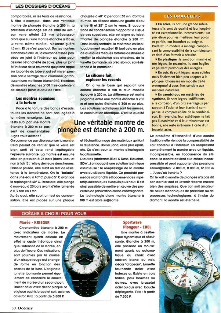 « montre de plongée étanche à 200 m ».Dans le cas contraire, la misérable est impitoyablement recalée ! Et tout cela en plus de quelques menues tortures destinées à vérifier la résistance des attaches, de la lunette tournante, sa précision ou sa résistance à la corrosion !