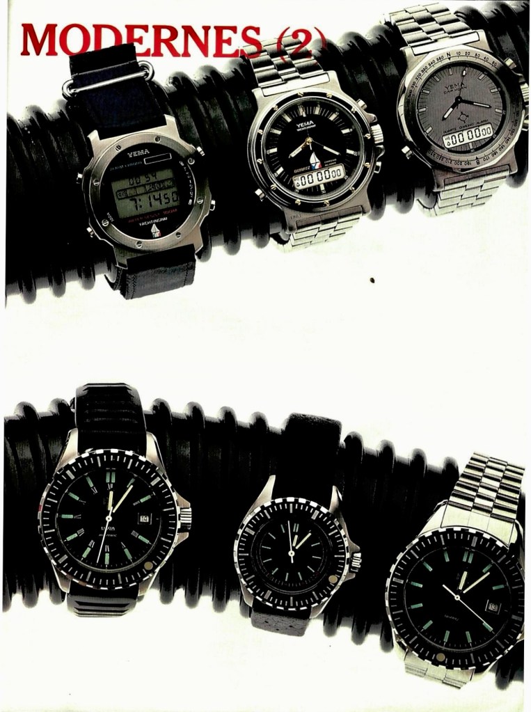 Yema. Une grande marque de l’horlogerie française de Besançon propose une gamme de montres sportives. Pour la plongée et les sports nautiques un modèle dame Navigraf étanche à – 100 m, couronne crantée à chiffres. Yachtingraf étanche à – 100 m, alarme, chrono au 1/100°, affichage numérique, éclairage, verre minéral, bracelet Kevlar avec Velcro pour le poignet ou par-dessus la combinaison. Yachtingraf, chrono, alarme, affichage mixte aiguilles et numérique, bracelet métallique. Cap Horn, chrono, alarme, affichage mixte, trotteuse centrale, top ho-raire, éclairage, lunette mémorisant le cap.