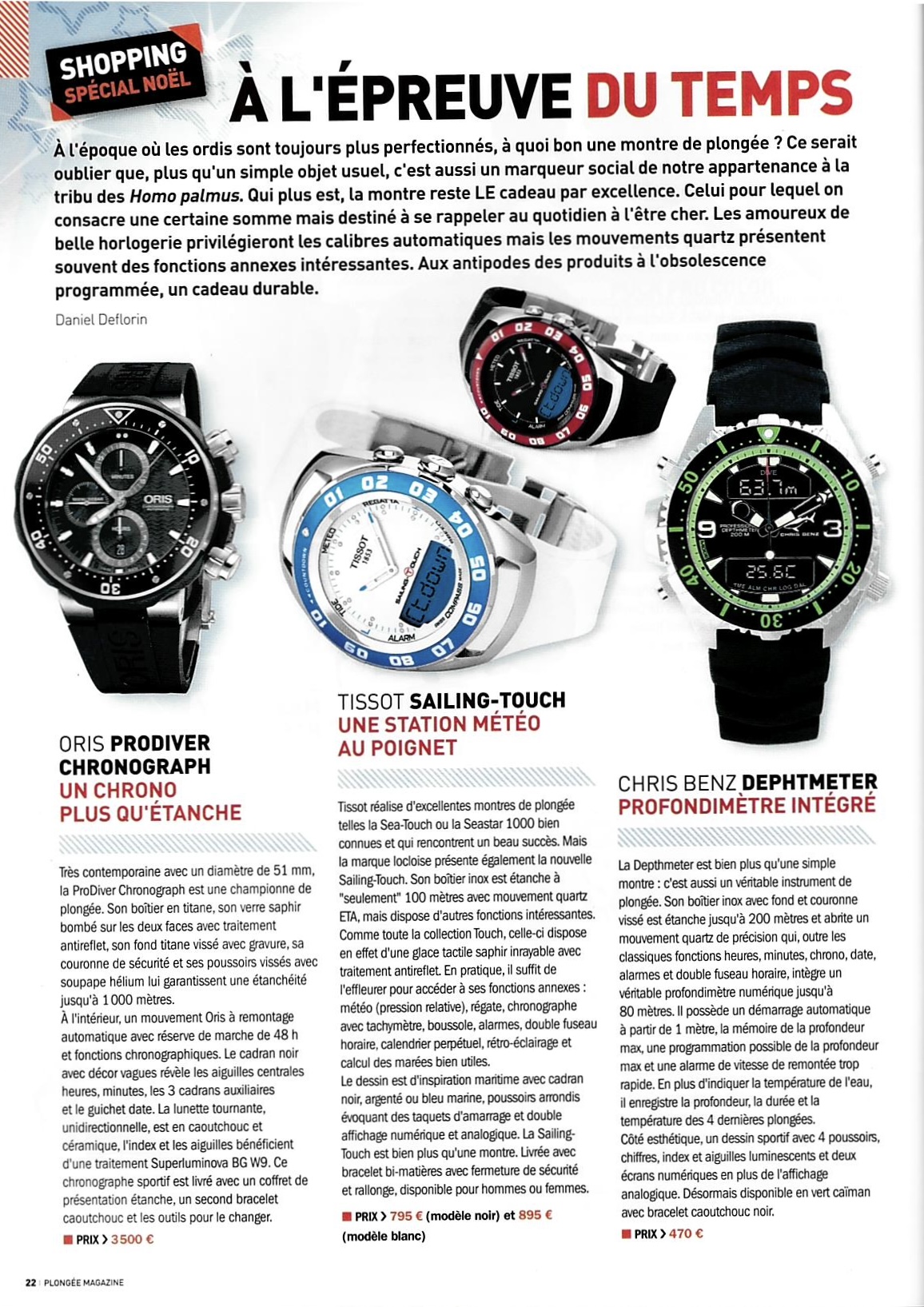À l’époque où les ordis sont toujours plus perfectionnés, à quoi bon une montre de plongée ? Ce serait oublier que, plus qu’un simple objet usuel, c’est aussi un marqueur social de notre appartenance à la tribu des Homo palmus. Qui plus est, la montre reste LE cadeau par excellence. Celui pour lequel on consacre une certaine somme mais destiné à se rappeler au quotidien à l’être cher. Les amoureux de belle horlogerie privilégieront les calibres automatiques mais les mouvements quartz présentent souvent des fonctions annexes intéressantes. Aux antipodes des produits à l’obsolescence programmée, un cadeau durable.