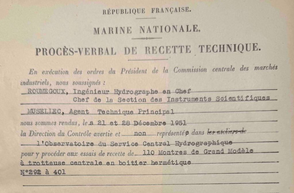 En 1951, le Service Central Hydrographique de la Marine Nationale signe une commande de 110 montres de grand diamètre auprès de Monsieur Auricoste (Horloger de la Marine Nationale).