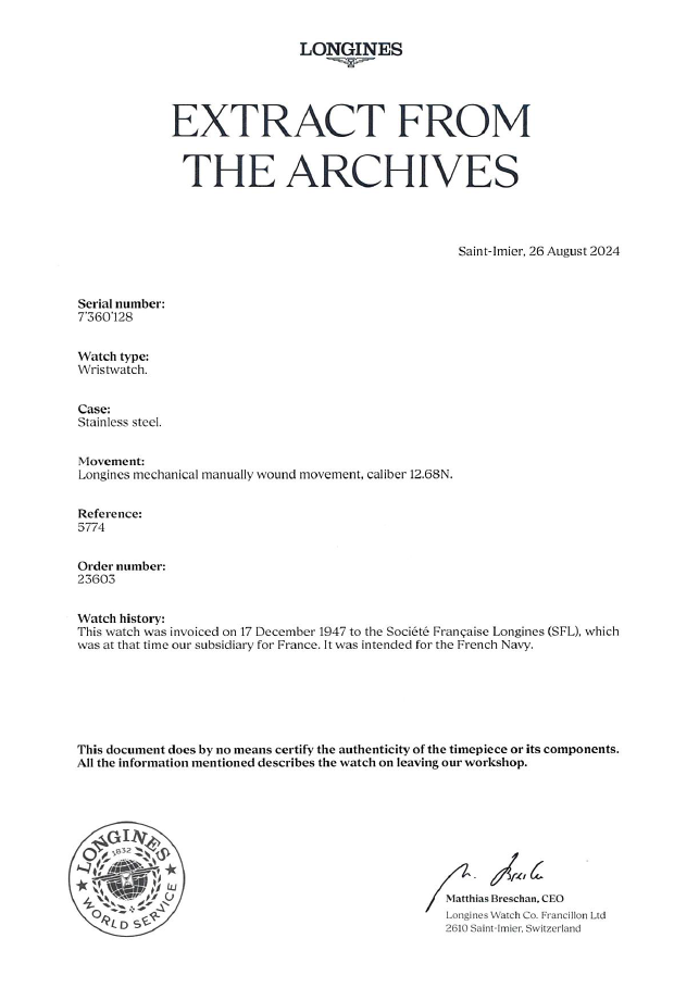 Cette montre a été commandée le 17 décembre 1947 auprès de la Société Française Longines (SFL), filiale de Longines en France. Elle était destinée à la Marine Nationale.