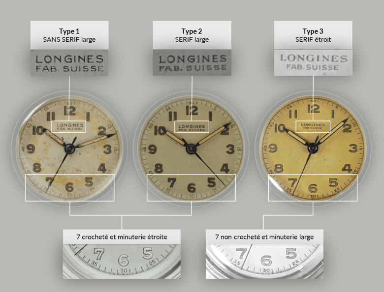On distingue 3 cadrans différents pour les Longines 5774, le modèle présenté plus haut est un type 2 (le chiffre est 7 est crocheté et la minuterie droite, Longines Fab. Suisse écrit dans une type avec empattement).