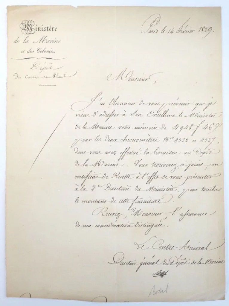 Parmi les documents présentés, l’un est rédigé par le Ministère de la Marine et des Colonies. Il s’agit d’un courrier adressé à Breguet, en date du 14 février 1829. Il mentionne deux chronomètres numérotés 4532 et 4537 livrés au Dépôt de la Marine.