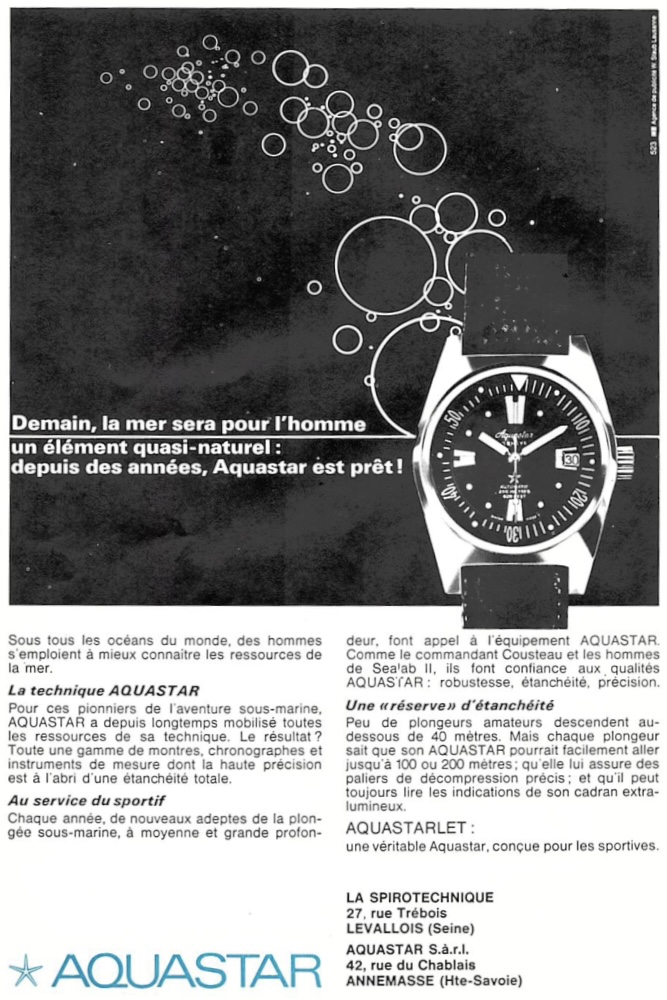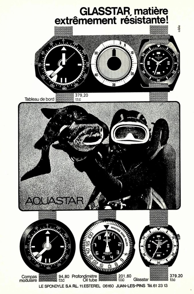 AQUASTAR, montres, chronographes, compas et tous les instruments sous-marins que vous DEVEZ connaitre pour VOTRE sécurité, VOTRE plaisir aussi (à la plage, dans la vie quotidienne où le caractère viril et dynamique de votre personnalité est mis en évidence ).