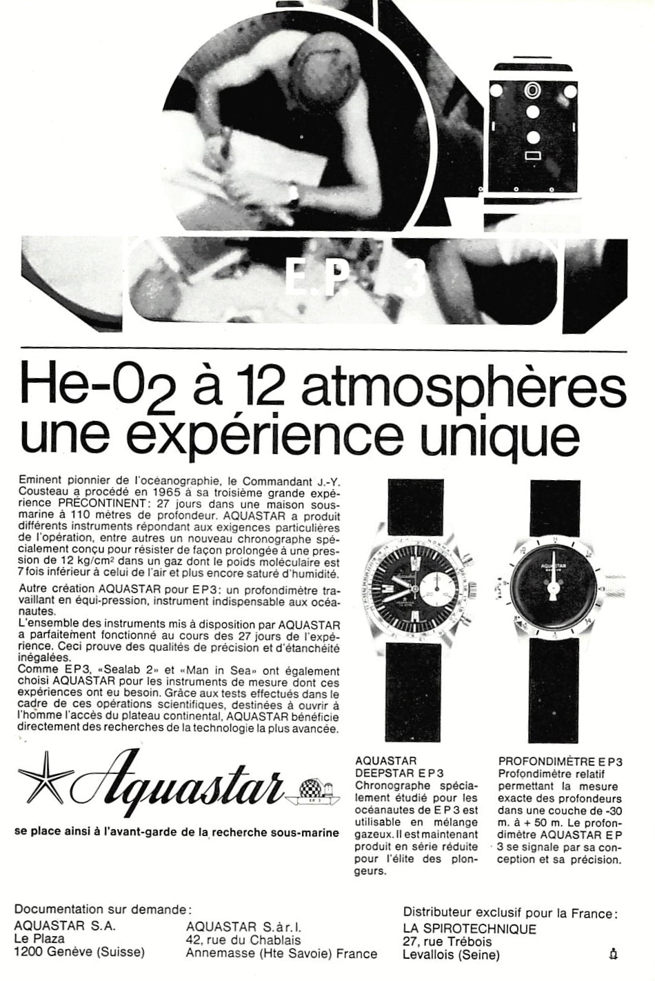 Eminent pionnier de l’océanographie, le Commandant J.-Y. Cousteau a procédé en 1965 à sa troisième grande expérience PRECONTINENT: 27 jours dans une maison sous-marine à 110 mètres de profondeur. AQUASTAR a produit différents instruments répondant aux exigences particulières de l’opération, entre autres un nouveau chronographe spécialement conçu pour résister de façon prolongée à une pression de 12 kg/cm2 dans un gaz dont le poids moléculaire est 7 fois inférieur à celui de l’air et plus encore saturé d’humidité.Autre création AQUASTAR pour EP3: un profondimètre travaillant en équi-pression, instrument indispensable aux océanautes.