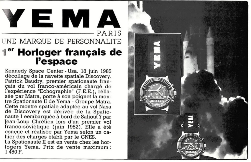 Patrick Baudry, premier spationaute français du vol franco-américain chargé de l’expérience « Echographie » (F.E.E.), réliasée par Matra, porte à son poignet la montre Spationaute II de Yema – Groupe Matra.Cette montre spatiale adaptée au vol Nasa de Discovery est dérivée de la Spationaute l embarquée à bord de Saliout 7 par Jean-Loup Chrétien lors d’un premier vol franco-soviétique (juin 1982). Elle a été conçue et réalisée par Yema selon un cahier des charges établi par le CNES.